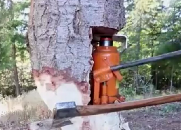 你認為千斤頂僅僅是用來起重汽車,支撐橋梁嗎?那你就大錯特錯了,千斤頂的作用遠不止這些,今天我們就來看一看千斤頂在伐樹時的妙用。