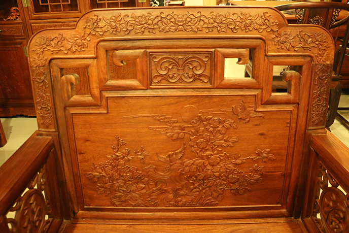 第三是中國的語言,它是紅木家具中出現頻率最高的圖案,福字紋、萬字紋、喜字紋、壽字紋,工匠們喜歡用文字來表達自己的美好祝福,給居室多增添生活氣息,掩蓋紅木家具給人的硬朗、威嚴的感覺。除了單個字體的文字外,其椅背等處還多見一些短語、警句、吉祥語或詩句,它們經過特殊的美化變形處理后,也極具觀賞價值。