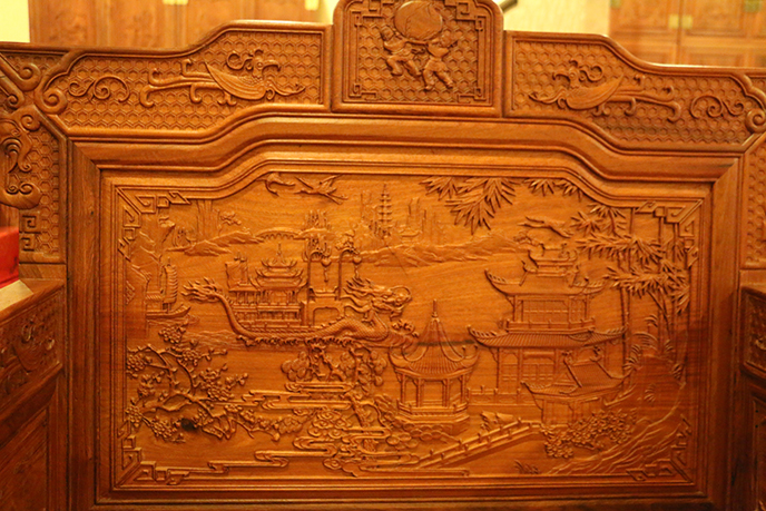 第四類,山水風景圖案常常和人物圖案結合在一起,出現在紅木家具上,山水風景多為名山大川,人物多是反映歷史典故、神話傳說、詩詞故事和文人生活的畫面,如游歸圖、南山觀瀑、五老圖、八仙圖、十八羅漢、嫦娥奔月、三星高照、群仙祝壽、百子圖、東籬采菊圖等,工匠們以中國畫的散點繪畫技法為基礎進行生動描繪和勾勒。