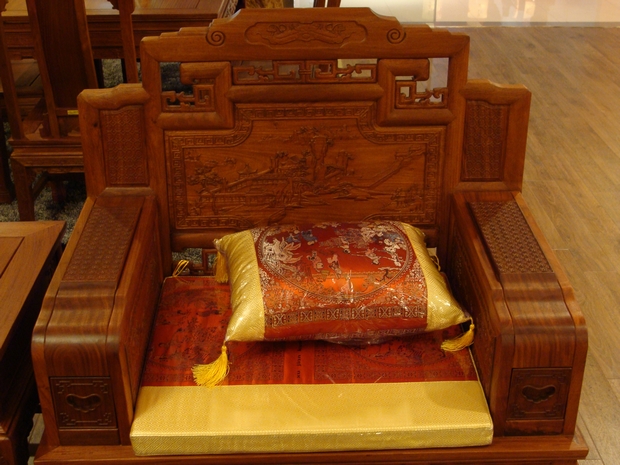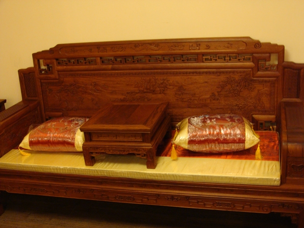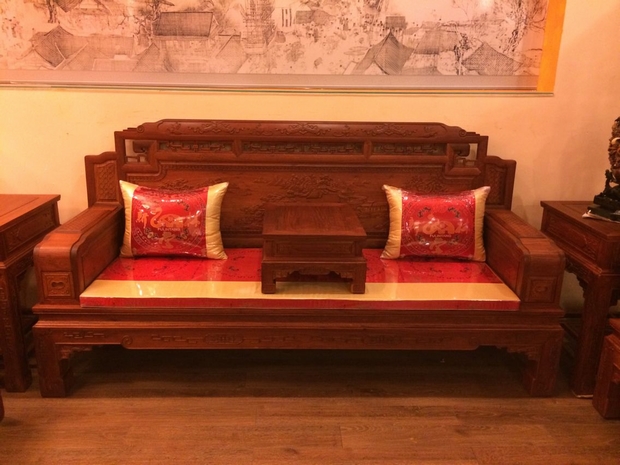 沙發整體的外觀給人的感覺顯得十分地端莊氣派,稍顯瘦高的座腳腿,筆直有力;平整寬大光亮的座面以及在其左右兩側豎立的玲瓏呈箱體式結構的扶手也彰顯著氣派與大方。