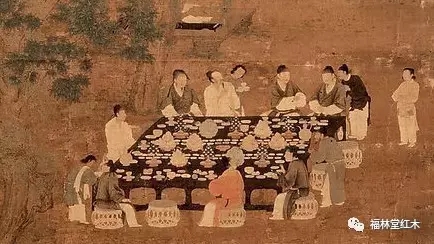上圖是一些雅士的聚會(huì),我們可以看到中國(guó)古代是分餐制的,大家圍到一起,在一個(gè)很大的“榻”四周。這個(gè)榻,我們仔細(xì)觀察可以發(fā)現(xiàn)它原本是“箱型”形制的。